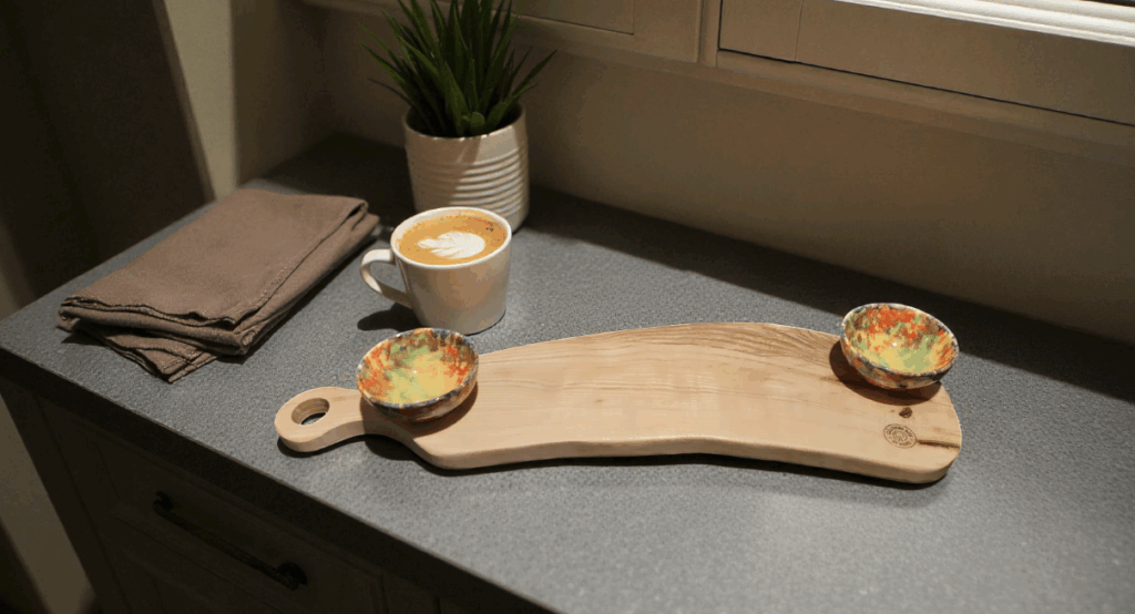 Chaque modèle associe la chaleur du bois naturel à de petits bols en céramique artisanale, parfaits pour présenter olives, fromages, charcuteries ou sauces.